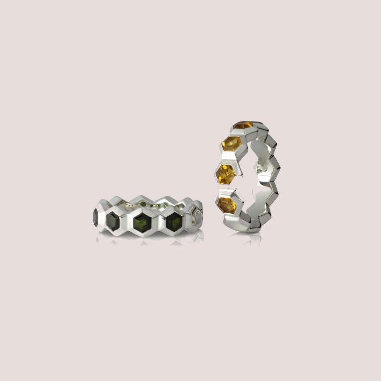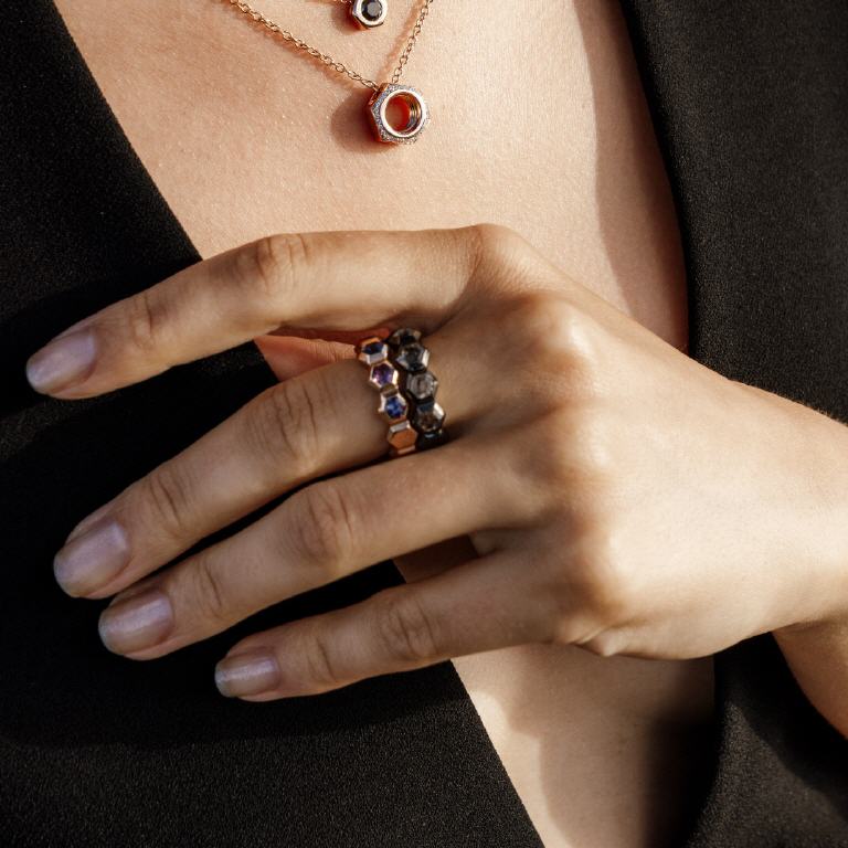 Fünf von elf Sechsecken sind mit Edelsteinen gefasst, so können durch unterschiedliche Positionen diverse Designs entstehen und jede Kombination erhält einen persönlichen Charakter. Durch Ausführungen in Silber oder Gold, verschiedenen Farben sowie Bedeutungen der Edelsteine können der Träger*innen das Schmuckstück perfekt auf sich abstimmen.