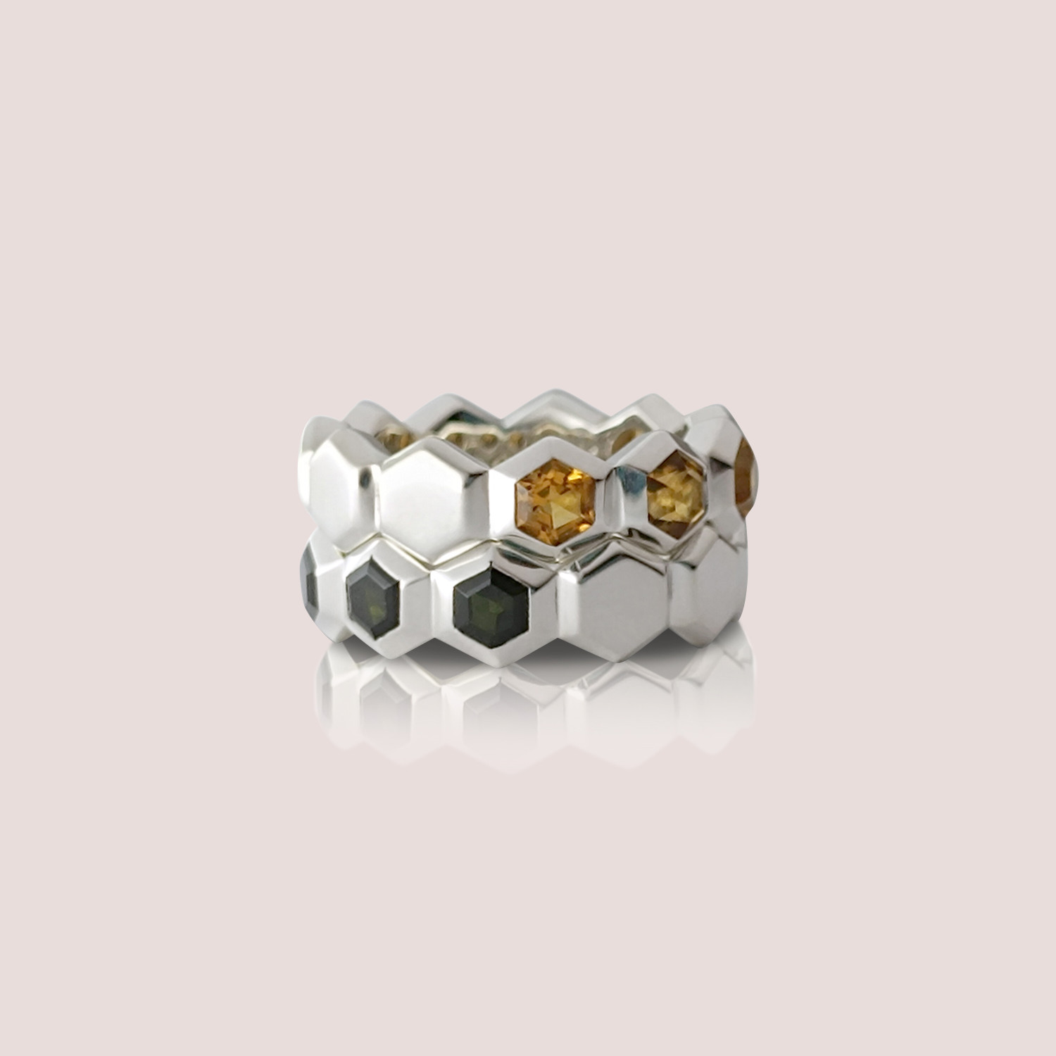 So matchen die besagten Ecken und Kanten, sowie die präzise von Hand gearbeiteten Flächen perfekt über- bzw. ineinander. Durch diese Anordnung haben die Ringe einen natürlichen Halt.